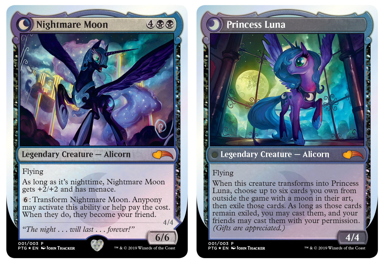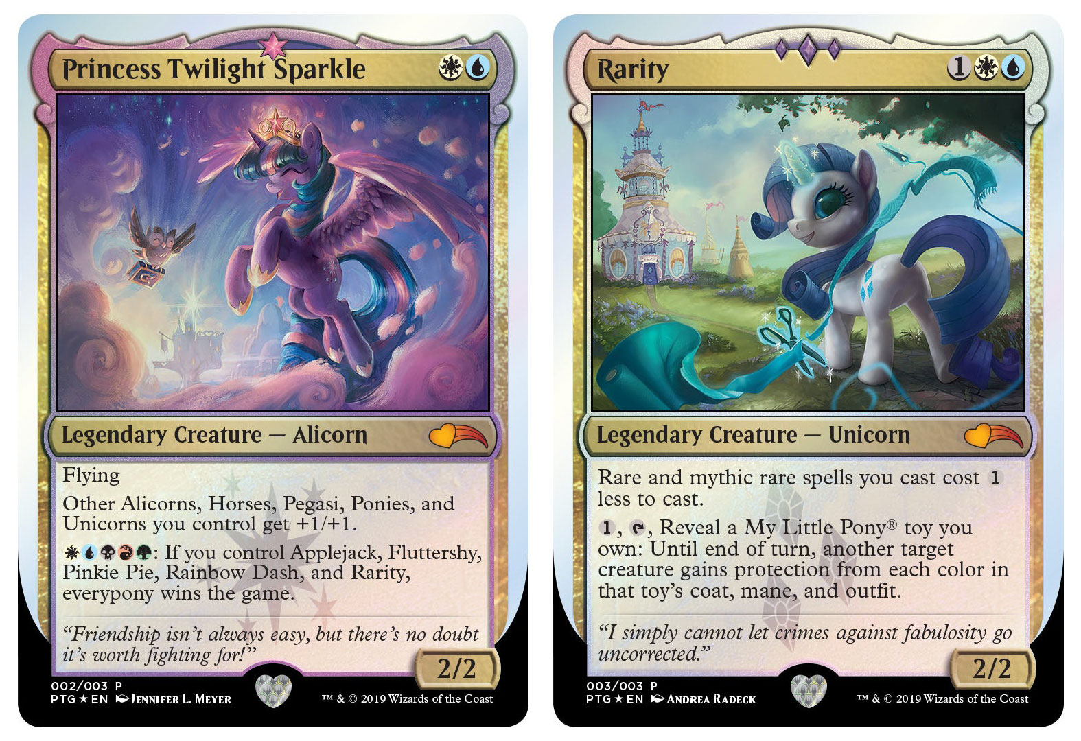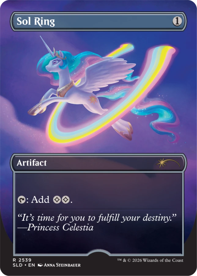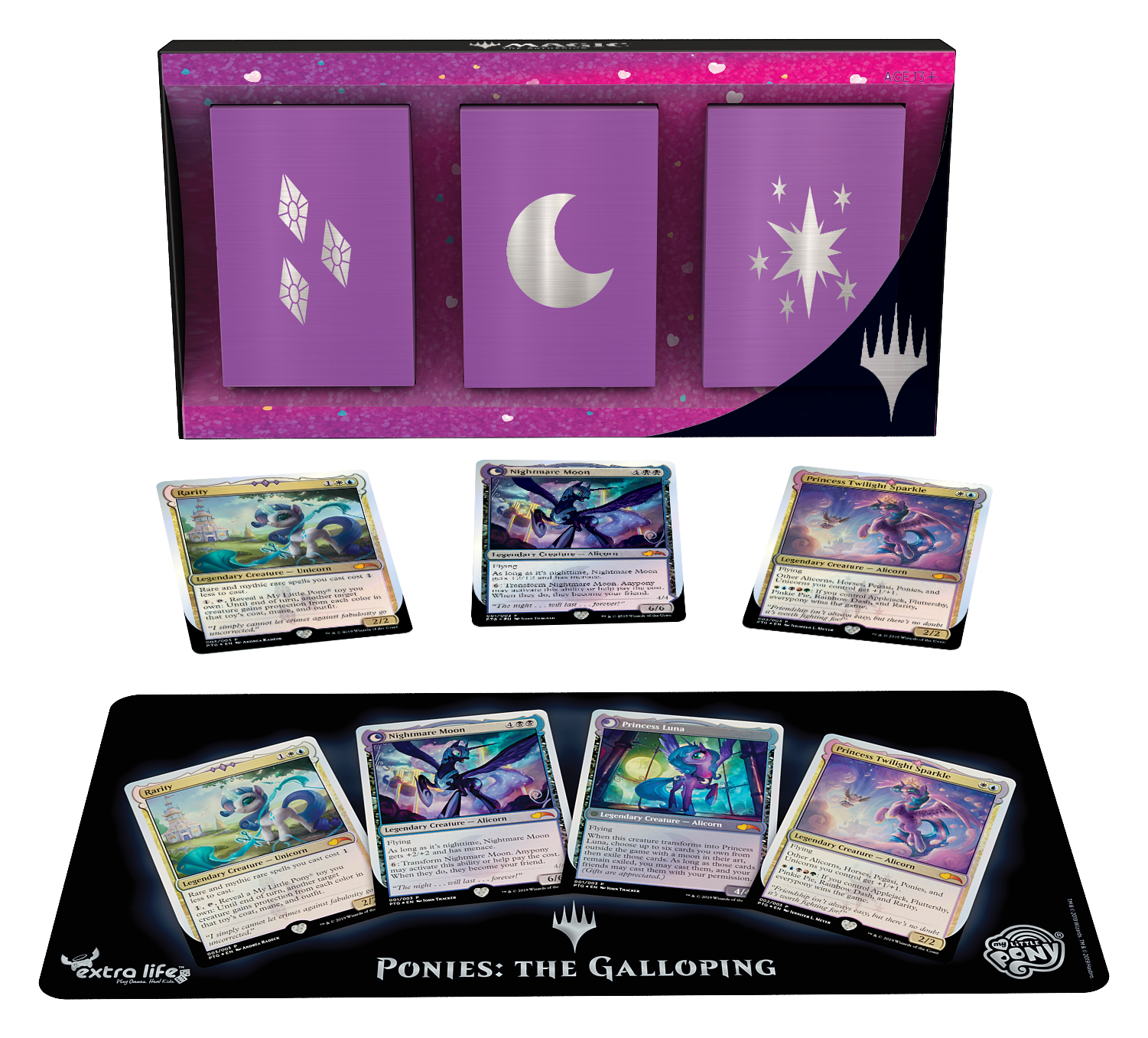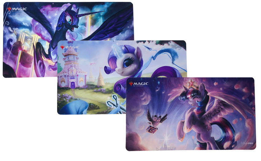 第一代小马宝莉万智牌联名Ponies: The Galloping (2019)的三张闪卡独家在HasbroPulse于2019年10月22日至11月5日以礼盒装的形式发售,售价50美元。这三张闪卡都采用按需限时印刷的形式,但同期发行了三张同图的限量牌垫 一套售价100美元